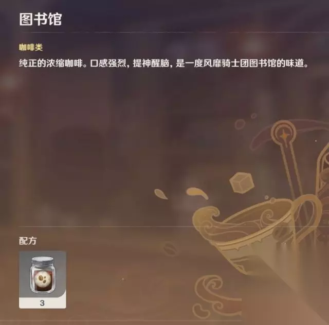 原神调酒配方大全 咖啡 1.图书馆:咖啡x3 2.星旋之夜:咖啡+牛奶x2 3.金色伊甸:咖啡x2+牛奶 4.月色暗巷:咖啡+牛奶+可可酱 5.远礁浮沫:咖啡x2+气泡水 6.焦糖松果:咖啡+牛奶+焦糖