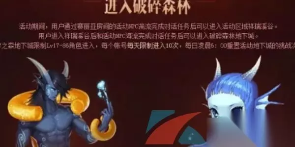 DNF手游破碎森林怎么进入 答:破碎森林在赛丽亚房间的NPC湍流近,需要和湍流得知祥瑞溪谷进入方法,进入后即可开启破碎森林副本。 1、玩家们进入祥瑞溪谷后,遇到神秘NPC海流,需要和NPC进行对话; 2、解锁祥瑞谷后,进入破碎森林地下城的地图,需要完成任务才能进去;