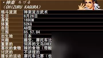 神乐千鹤 格斗流派 神楽流古武术 生日 6月26日 身高 169CM 体重 52KG 血型 AB型 三围 85.57.84 出生地 日本 兴趣 睡觉,摩托车比赛 重要的 饲养的文鸟CHEE 喜欢的食物 辣的食物带酸味的更好 讨厌的 不讲理的 擅长的运动 摩托车比赛也是兴趣