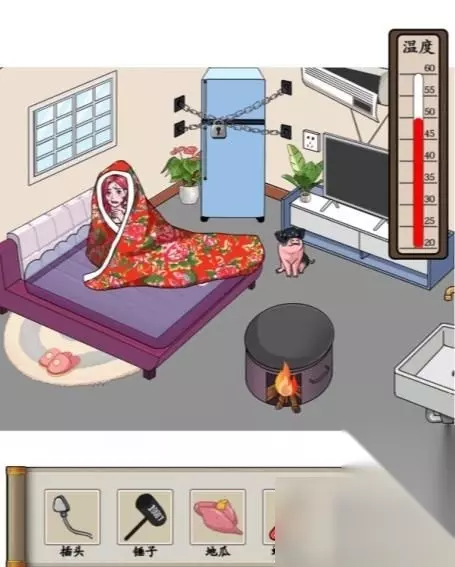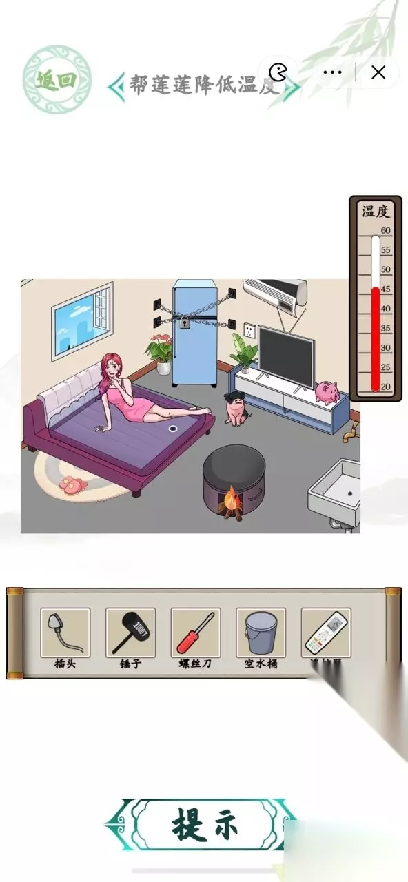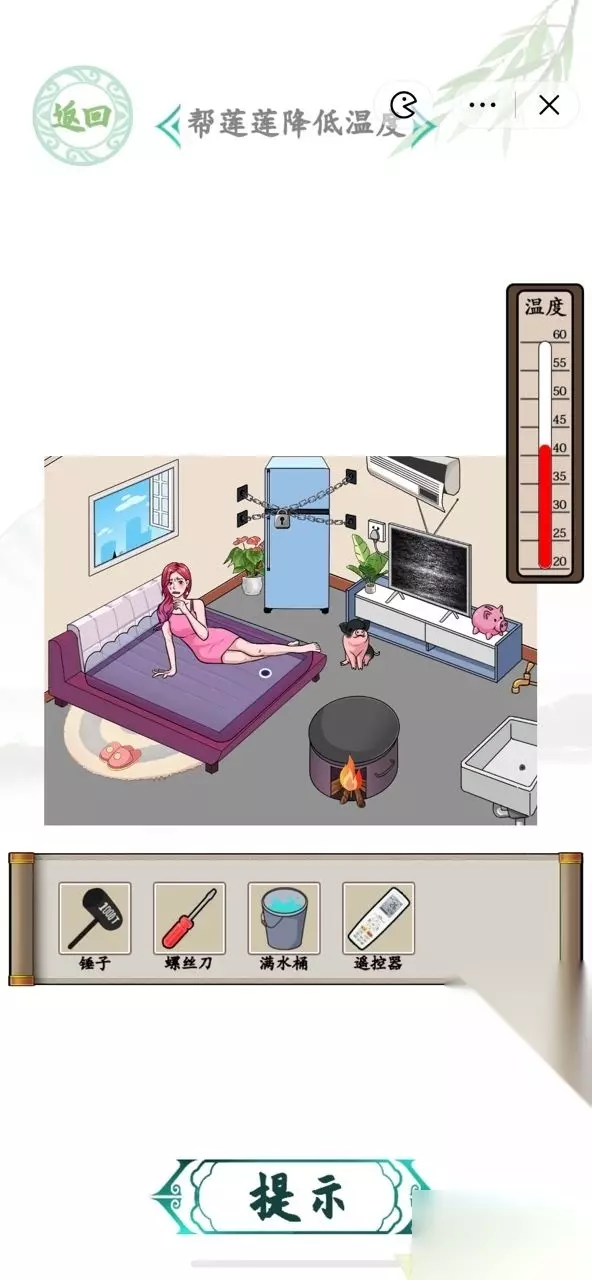 6.拖动螺丝刀到空调。 7.拖动遥控器到空调。 8.拖动锤子到存钱罐获得钥匙。 9.拖动钥匙到冰箱点击冰箱。 10.拖动冰淇淋给莲莲。