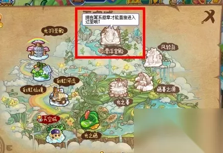 《洛克王国》漂浮宫殿位置介绍 位置介绍: 1、进入洛克王国后,点击下方的地图,在地图中找到天空城。 2、将鼠标放置在天空城上,可以看见漂浮宫殿) 3、在天空城的上面点击天空城就可以直接进入了。 4、有些玩家会发现自己无法进入漂浮宫殿这一片区域。 5、是因为玩家没有获得翼系的徽章导致的。 6、玩家获得任意的翼系的徽章就可以进入漂浮宫殿这张地图了。