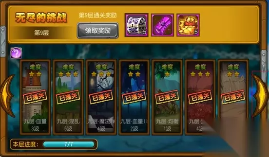 1.无尽的挑战一共为10层。每通过一层都会获得丰厚的奖励。 2.每层奖励需完成当前层每一个小关。 3.完成当前层全部小关后可进入下一层。