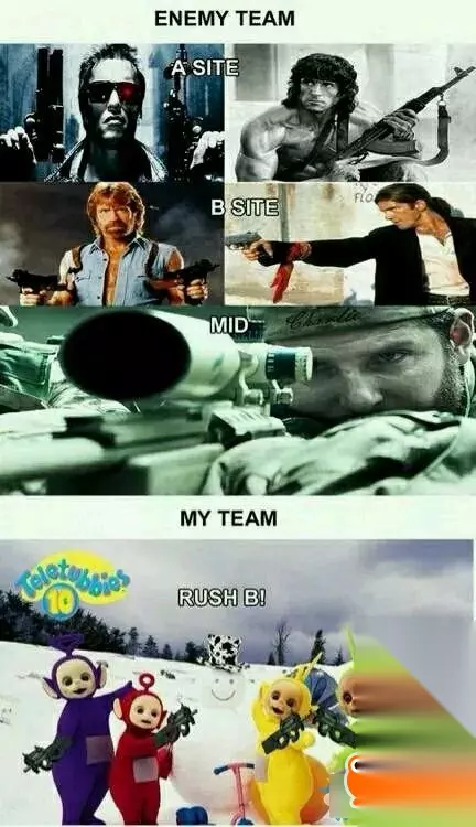 在《CS:GO》中最热门的地图是Dust2,而这张地图有两个埋包点A和B点,其中B点的空间较为开阔,作为进攻方比较好进攻,很多时候作为T方都会采取这个进攻战术。 虽然Rush B看起来很暴力,但是如果CT防守得力很容易反杀Rush的队伍。而在新手Rush B过程中,经常会出现各种各样的问题导致翻车(冲出去发现队友全跑,一颗闪光弹丢到你脸上等等)。此等事情每天都会上演,久而久之,便成为了世界人民喜闻乐见的梗