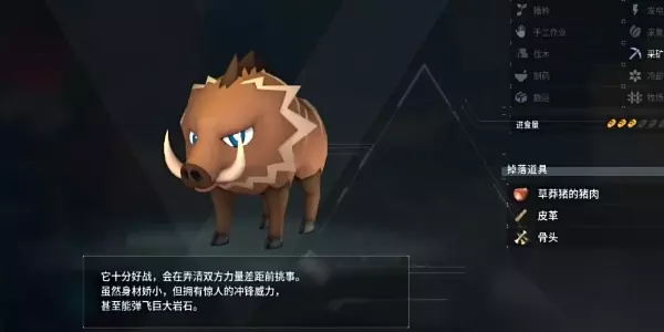 草莽猪信息介绍 幻兽:草莽猪。 掉落物品:草莽猪的猪肉、皮革、骨头。 工作适应性:采矿LV1。 进食量:3级。 技能(坚硬头壳):可骑在它的背上移动,骑乘斯问破坏岩石的效率会更高。