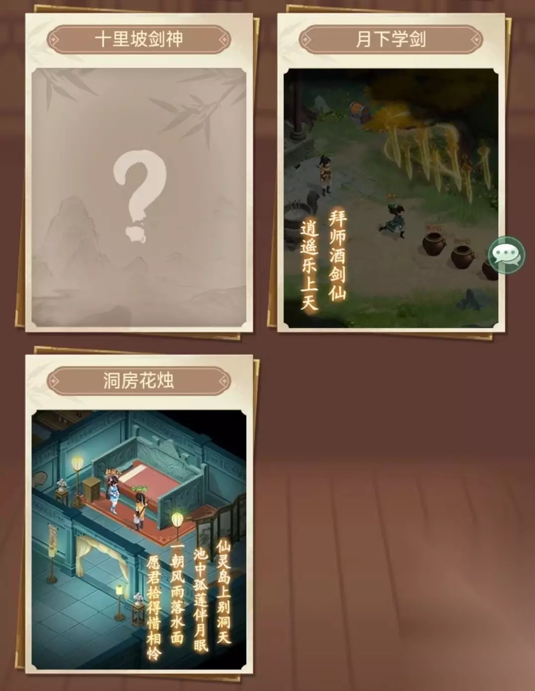 仙剑中的经典环节都在这里有所收录,例如李逍遥和赵灵儿在仙灵岛上的洞房花烛,李逍遥和酒剑仙学见识的月下学剑,接下来还有十里坡剑神,比武招亲,魂断塔底,塔中相会等,相信这些名字,大家在看过之后就会涌现出一段段回忆。再加上进入前尘夜梦之后,整个游戏的背景音乐也会出现变化,抒情的音乐搭配上这些熟悉的名字和诗句,将大家的思绪再一次拉到当年的单机时代。