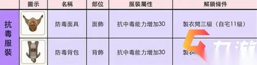 除了抗雾,在暮夕森林的部分地区还有毒雾,那么就得用到抗毒服装了,比如“防毒面具”和“防毒背包”这两种,都可以增加30的抗毒能力,一般平时带1个就够了。同样,也是需要3级制衣间解锁。
