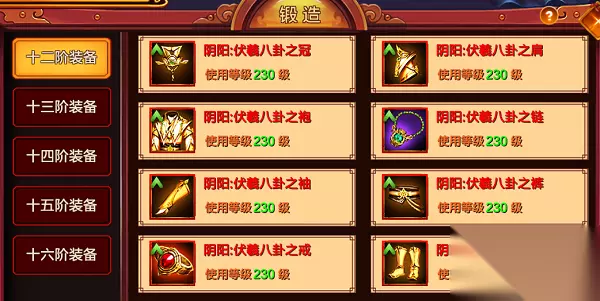 上图为锻造功能中装备锻造的展示,从十二阶至十六阶的红色装备都可以通过锻造获取。