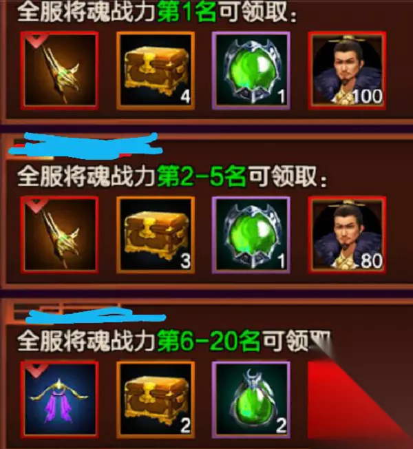 上图为将魂战力挑战排名奖励,可奖励中期很重要的红阶装备哦