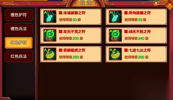 上图为锻造功能中兵法、护符锻造的展示,橙色兵、符从八阶至十三阶,红色兵、符从十阶至十五阶,都可通过锻造获取。
