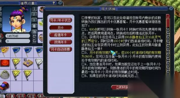 梦幻西游月卡时间怎么算 1、账号冲进去600点,然后进入游戏转换成月卡,一个月内100小时,送200仙玉。100小时必须在一个月内用完,否则到期自动清空了。 2、你要是想查询剩余多少时间可以alt+q点开任务,有时间提醒的,能查看当前月卡到期时间和剩余多少小时。