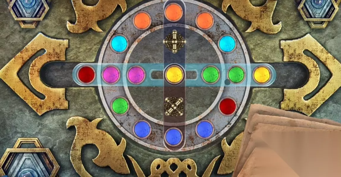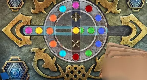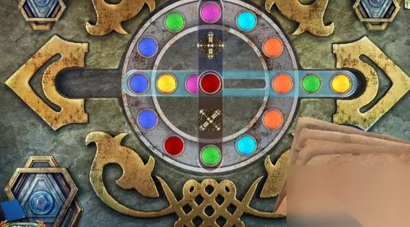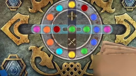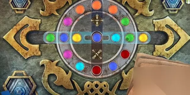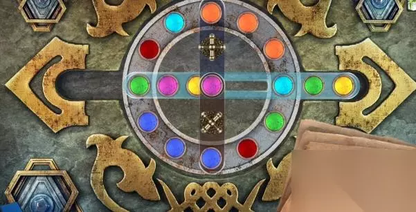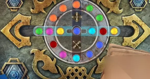 17、顺时针转动三个筹码的位置,再点击上面的交换部件,将黄色的筹码与粉色的筹码交换位置,交换后黄色的筹码在中间位置。