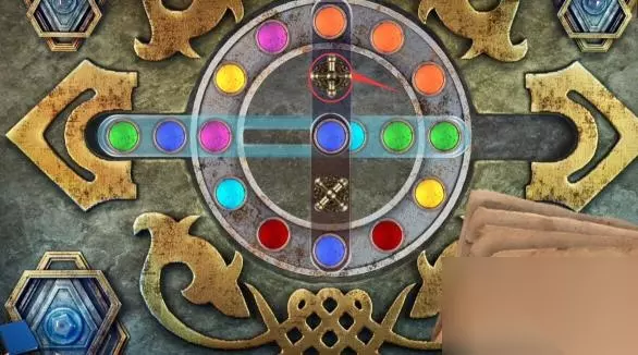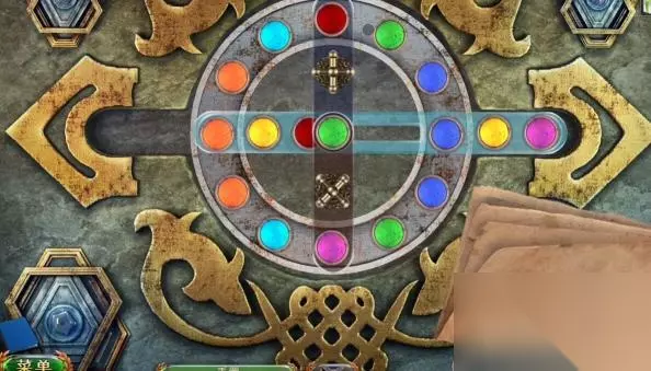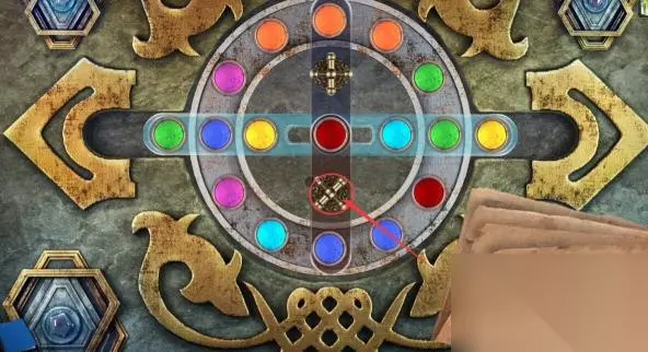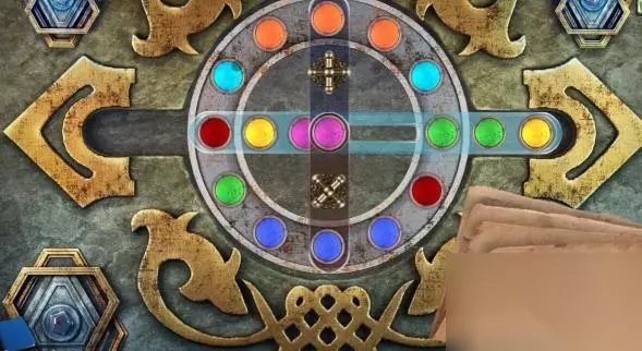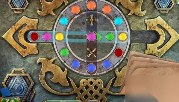 14、顺时针转动三个筹码的位置,再转动上面的交换部件,将粉色的筹码转动到中间,浅蓝色的筹码转到上方。