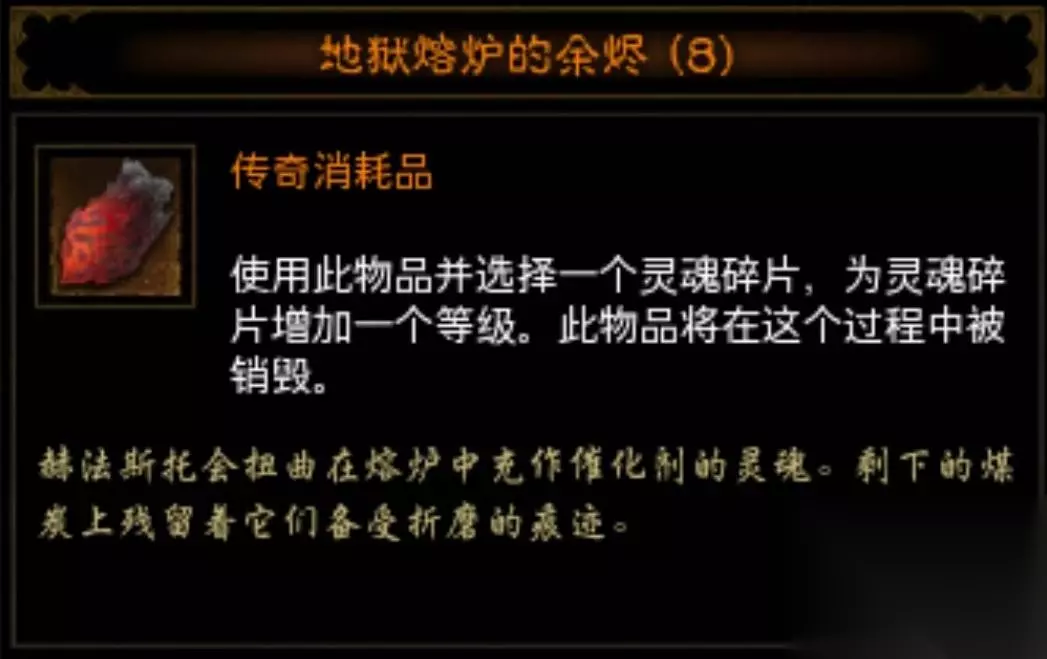 2.然后我们就需要赛季中掉落的另外一个消耗物品——地狱熔炉余烬来进行升级,每一次的升级都需要一个余烬。