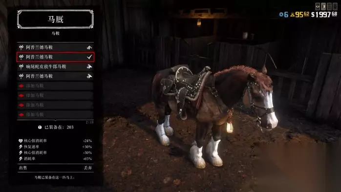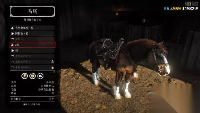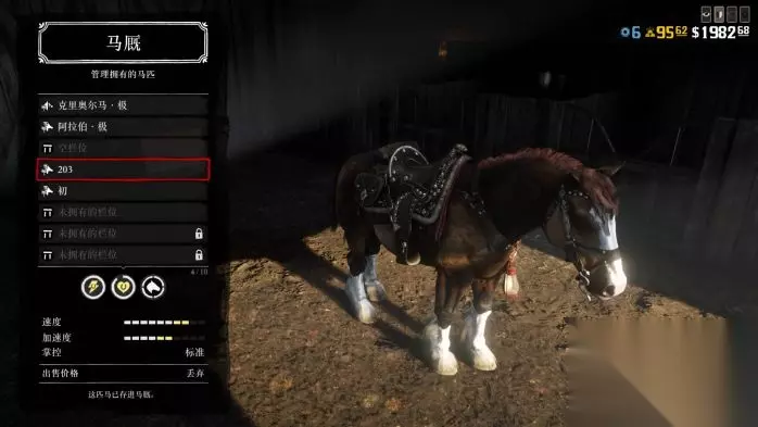 ========================================================================== 4.赏金猎人20级的马一定要买,这马身材高大并且不会受惊逃跑,体力4级亲密度后是满的,身材高大甚至能踢死鳄鱼,遇到猛兽其他马早摔下你跑了。这个马也不容易撞树撞其他东西,而且下坡也不会直接飞出去。 (胆子最大数值第二的马,570美元)