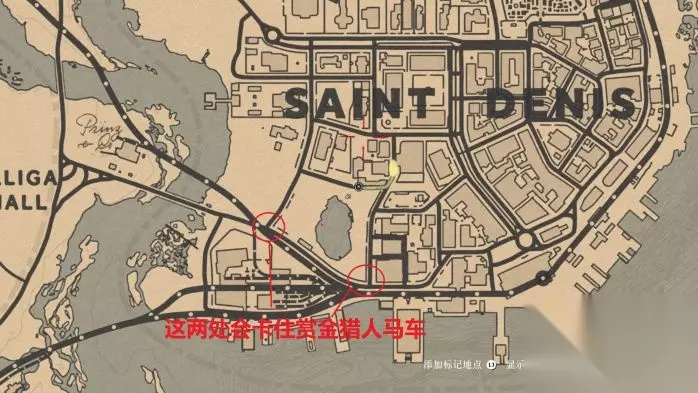 在如图位置叫车,赏金猎人马车就不会被路上车辆卡住,图3那两个圈地方是最容易卡马车的。