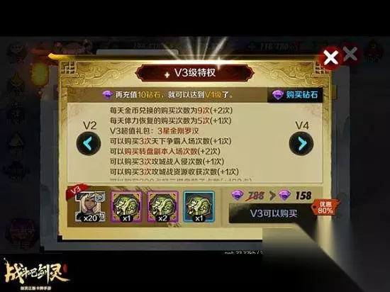 VIP3 特权升级,3星金刚罗汉 VIP3特权的超值礼包是158钻石购买的三星金刚罗汉以及多个锻造材料、强化材料。拥有给力前排后,可以提高阵容的抗打能力,给后排强力攻击卡牌提供一个优秀的输出环境!VIP3之后战力提升一个阶段,是实用主义小资玩家的上上之选。