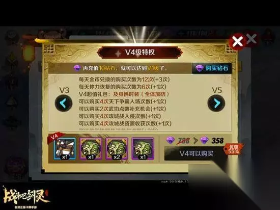 VIP4 整体提升,及身佛时装 VIP4特权礼包是358钻石购买的及身佛时装。装备之后可以全体加防,物理防御和气功防御各增加16,PVP对战,全体防御提升之后,直接让对手无从下手。VIP4特权一套服饰两种好处:既好看又能提升战力,相信爱美一族玩家一定不会错过!