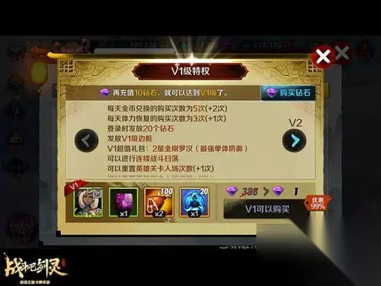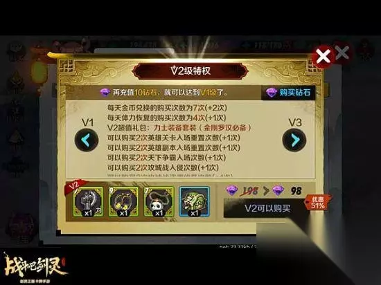 VIP2 超值月卡,力士装备套装 VIP2特权除了在VIP1特权的基础上,各项次数均再加一次,金币兑换次数增加2次之外,还可以花费98钻石,购买VIP2特权礼包。内含力士装备套装。可将力士金刚罗汉的战力提升一个等级,对战打副本都将更加给力!并且充值300钻石后的30天内,每天都将获得100钻石的奖励,在前期的战斗中,再也不用担心没有钻石购买体力了!月卡族的最佳选择,性价比超高!