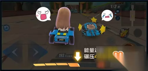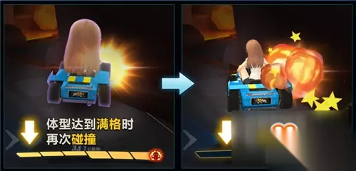 当玩家通过碰撞储蓄能量到第4格的时候,体型就会增大到可以压扁场上能量为3格和3格以下的玩家,被“巨人”撞到的玩家将会被压扁,并且短暂减速。伴随着一声被压扁的提示声,巨人车手将用更快的速度超越被压扁的玩家,向终点前进! 落后的车手也不必气馁,巧用碰撞增大体型,奋起直追吧!