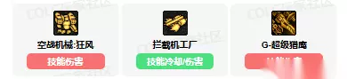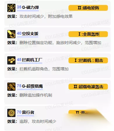 技能进化加点 35级【G-磁力弹】加点:感电矩阵 生成5S反应电场,造成单次伤害,命中敌人附加3S感电 40级【空投支援】加点:全面轰炸 删除指定投放的功能,多段爆炸4次,范围增加 45级【拦截机工厂】加点:拦截机阻击 范围增加,追踪敌人且拦截机存在15S,切换房间不会消失 70级【雷行者】加点:雷行者追击 追踪敌人,攻击时间减少 75级【G-超级猎鹰】加点:超载电波轰击 删除追加操作,多段攻击8次 技能强化 1、空战机械狂风:技能伤害 2、拦截机工厂:技能冷却/伤害 3、G-超级猎鹰:技能伤害