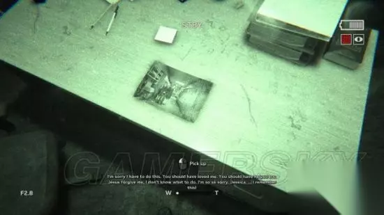 step2.Blake又来到了中学教学楼当中。 从教室旁侧的门进入到音乐室,在音乐室的桌面上可以看到Jessica与同学的合照,也就是拿到一份文件(1/8)。 外出到走廊,可以进入到走廊右侧的档案室,推开电视柜可以拿到一个电池。