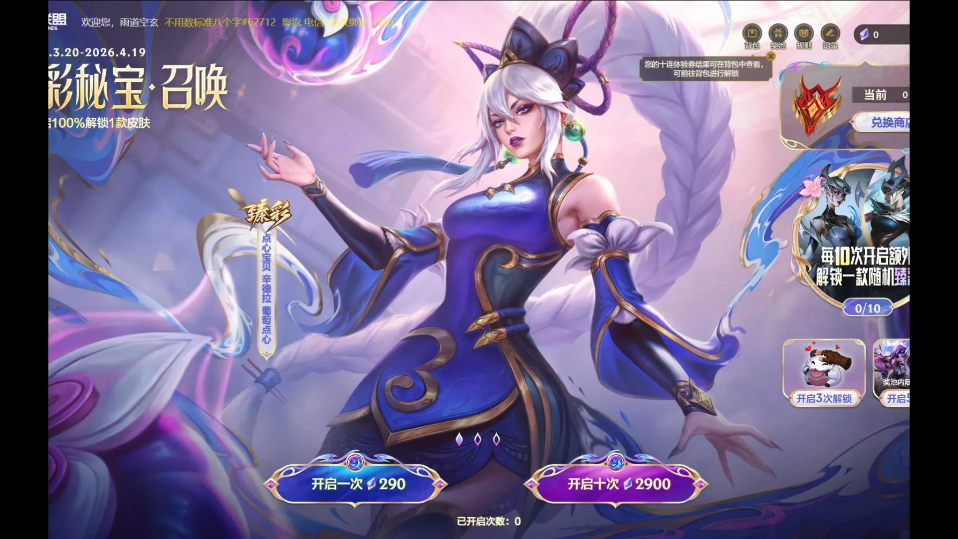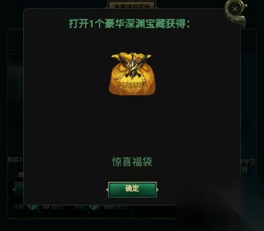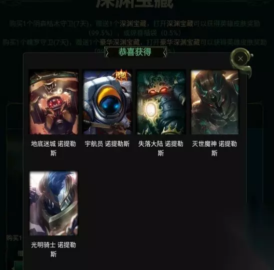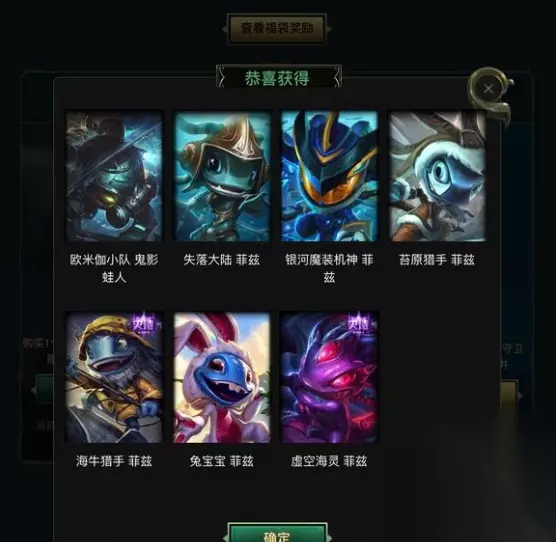 此外,还有一位好运玩家也获得了一个惊喜福袋,不过他不是用精粹换的,而是花了100RMB才抽到的。打开福袋获得了深海泰坦的5个皮肤。虽然比起小鱼人的要逊色一些,但也还算不错了。不过,最重要的是抽中的玩家喜欢这个英雄才行,否则皮肤再多也是浪费。