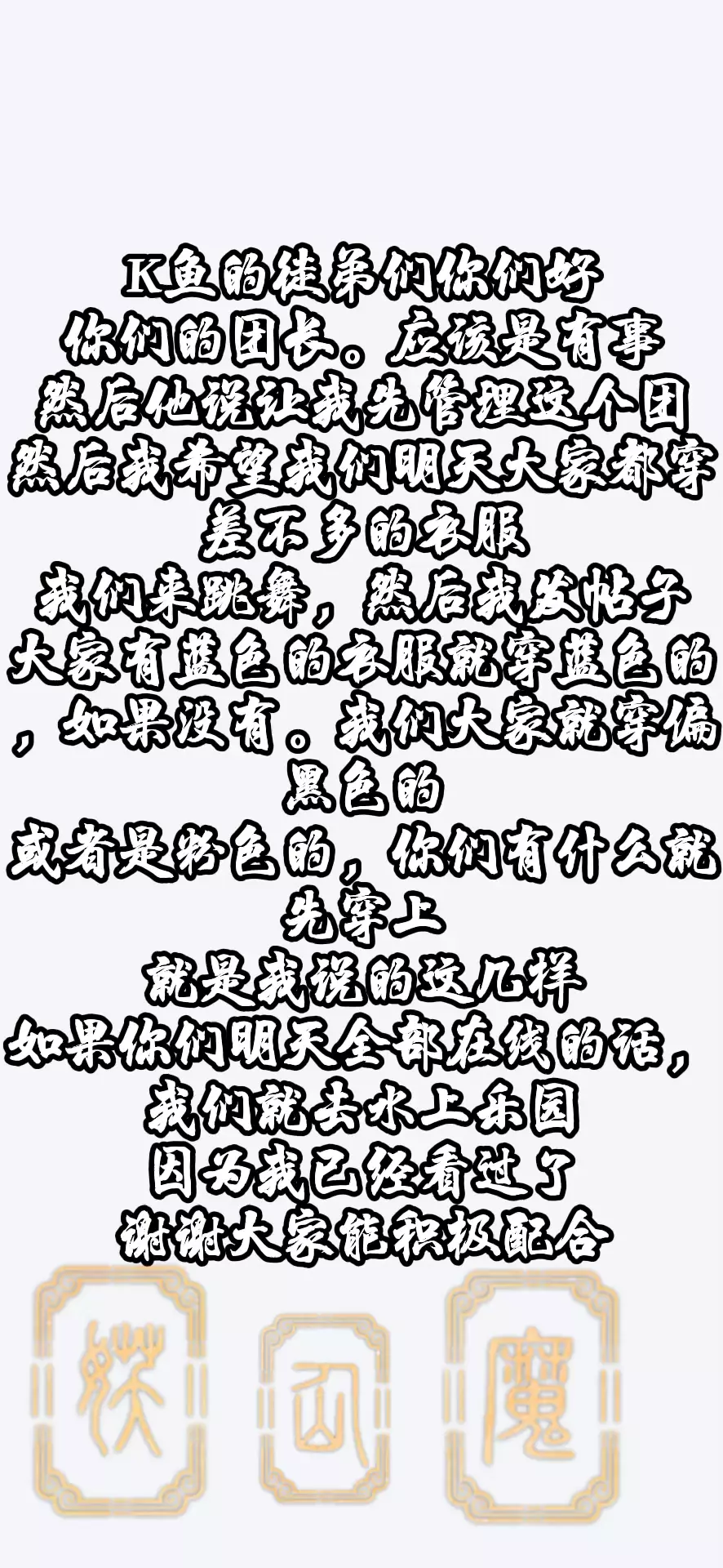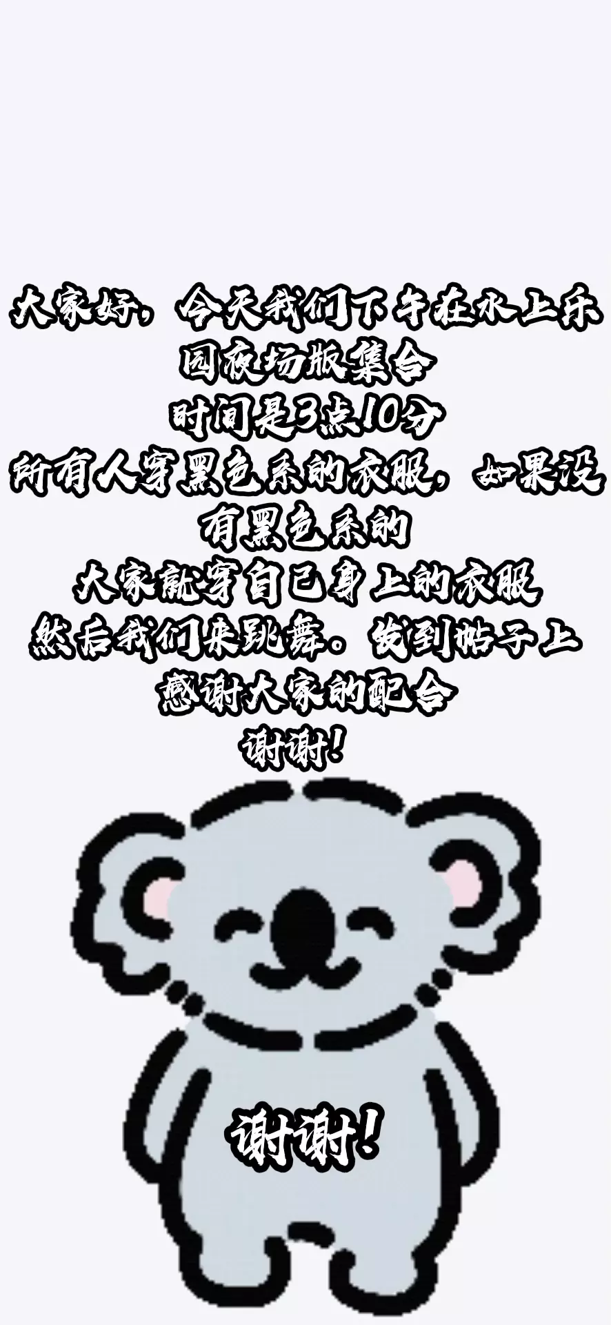 希望大家能准时3:10的时候来到水上乐园。夜场版我们来跳舞,发到帖子上,感谢大家的配合
