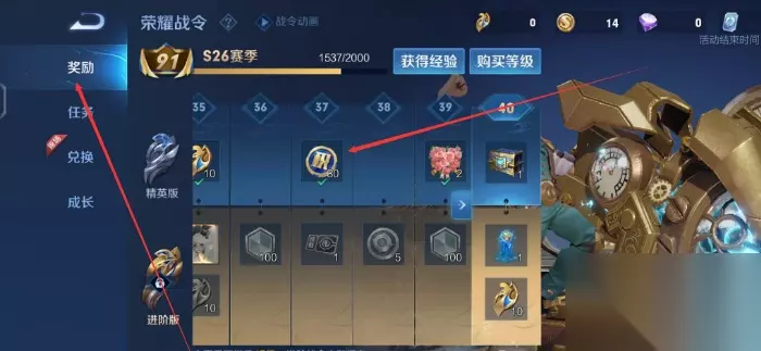2、通过战令获得: 我们在战令获得一定的等级时,可以领取荣耀积分。