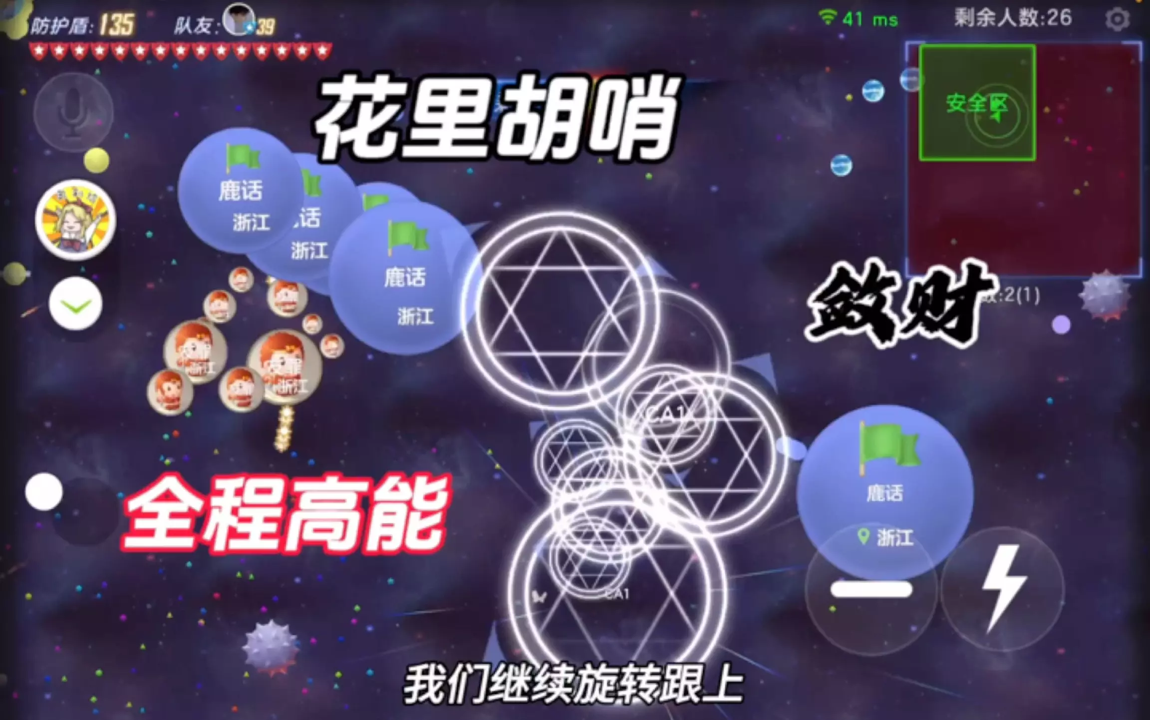 这是《球球大作战》的旋转蛇手教学帖,通过实战画面展示该操作的运用场景,玩家可学习在对局中利用旋转蛇手操作,在安全区变化、与其他玩家竞技的过程中提升对战技巧,助力在游戏中取得优势。