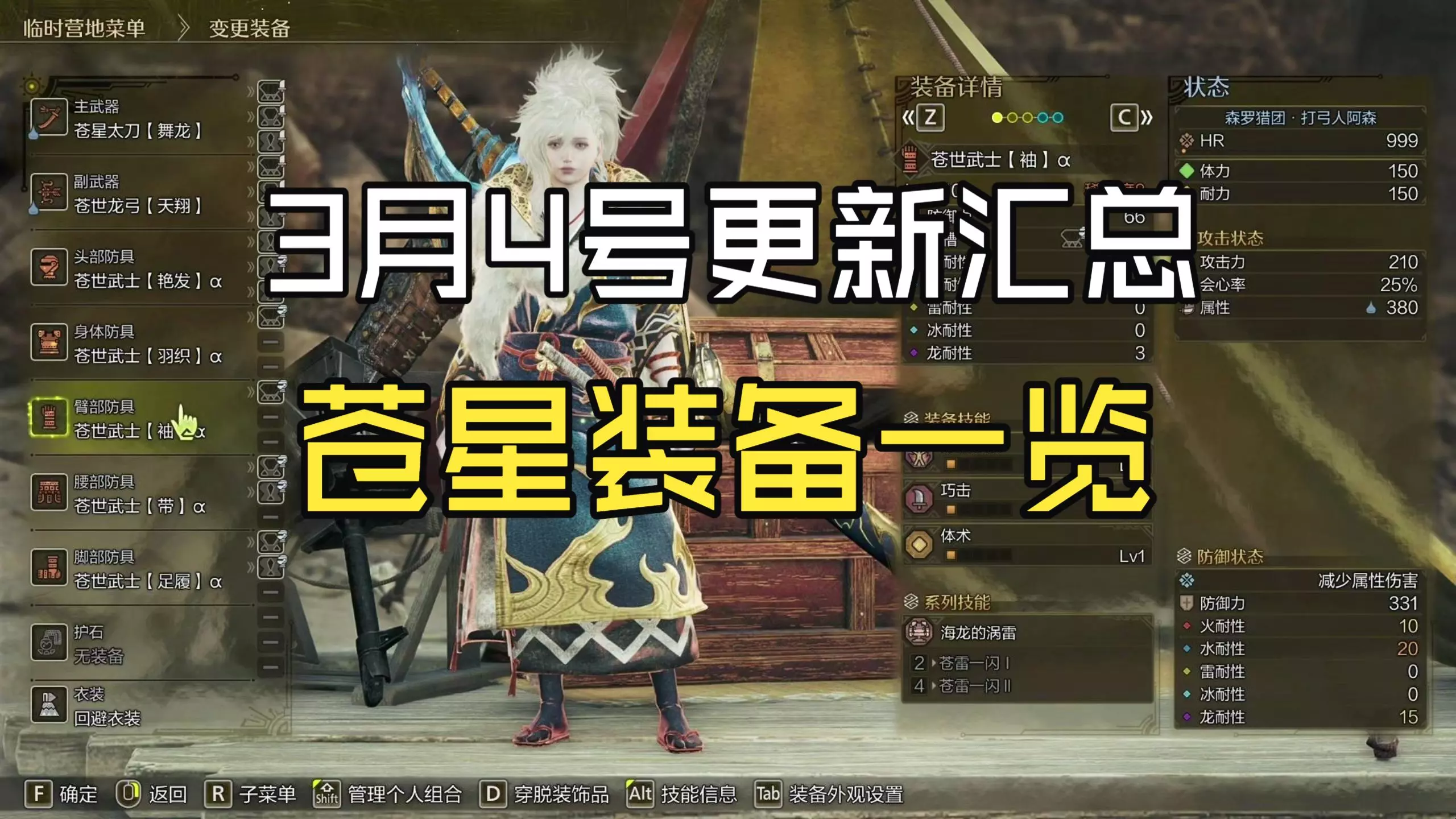 黑蚀龙腰甲护腿还能再战不用换 头部身体换成纯洁龙β 这次更新后精神抖擞的设定改变,只要在两秒内回满体力就不会掉BUFF,一个翻滚是不会掉的。 可以把护雷颚龙装备收起来放仓库了 手臂换护锁刃龙腕甲β 开启3件套「龙都的庇护」