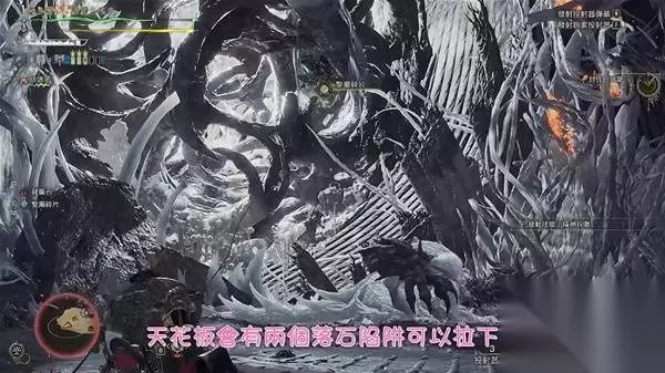 3.白炽龙转场吐完火之后,天花板会有两个落石陷阱可以拉下来,单人狩猎一个可以造成2500左右伤害。