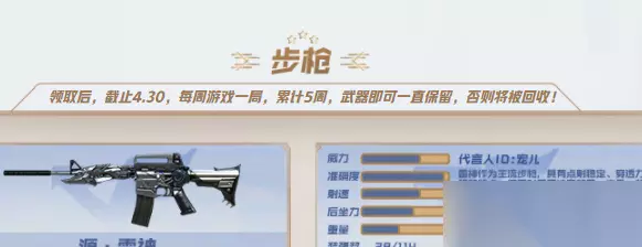 2、截止到4.30玩家每周可以领取不同类型的武器,让你可以轻松获取自己想要。
