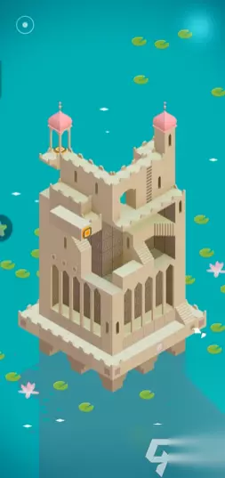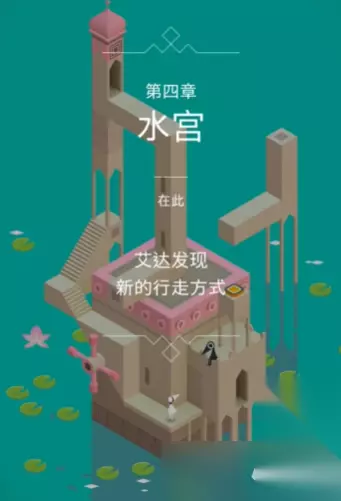 进门之后会来到一个城堡内部,这里你需要让艾达走到发光的人物面前进行一段对话,完成对话后,点击让她进入画面左边的门中。出门后又回到了外部场景,这时下方依然有粉红色的机关可以操作,你再次向上转动这个粉红色的机关,使面前的道路最终连接起来,形成一条完整的通往终点的路,最后点击让艾达走到终点位置,第四关水宫就顺利完成了。