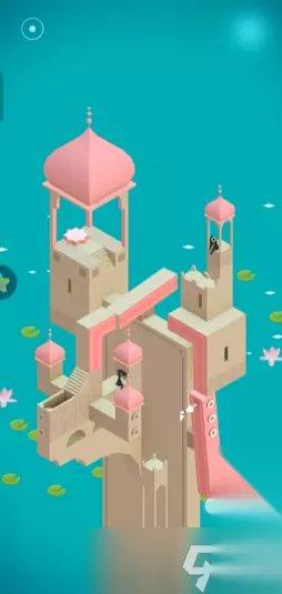 踩下按钮后艾达会被传送到又一个城堡场景,你首先让她走到中央的粉红色道路上,然后向下转动画面右侧那个粉红色的机关,使道路连接起来,点击让艾达走到这条小路的尽头断口处,接着你需要向上转动画面下方的另一个粉红色机关,让中间层的小路连接好,引导艾达走到中间的小路上,之后再次向下转动这个粉红色机关,这次操作会把中间的小路与左边的道路断口连接起来,点击让艾达走到这个新路径的尽头,此时再转动场景左侧的一个机关,使最后的道路与一扇门相连,让艾达进入这扇门。