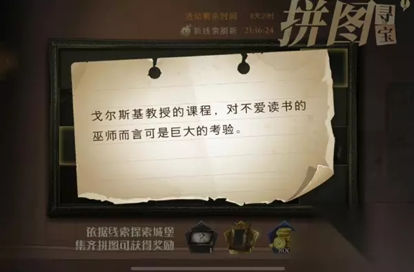 【第二块拼图】 1、线索:这间教室里总是充斥着烧焦的坩埚味道。 2、位置:在魔药课教室,要配制魔药获得。 3、寻找方法: