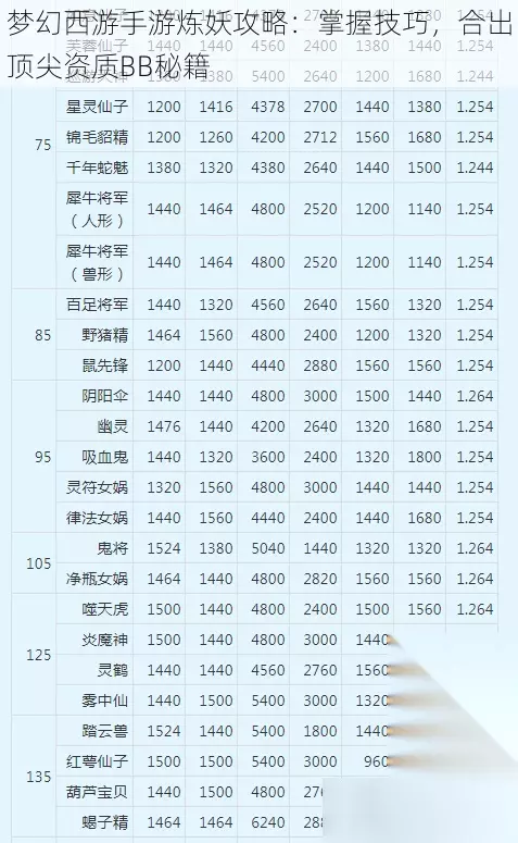 梦幻西游手游中的炼妖系统直是玩家们追求的极致挑战之。通过炼妖,玩家可以合成强大的宠物,进步提升自身的战斗力。本文将为大家分享些炼妖攻略,帮助大家掌握技巧,合出顶尖资质的BB秘籍。 了解炼妖基础 在炼妖之前,玩家需要了解炼妖的基础知识和规则。包括不同种类宠物的资质差异技能特点等。玩家还需要熟悉炼妖石的获取途径和使用方法,了解合成宠物的成功率与哪些因素有关。