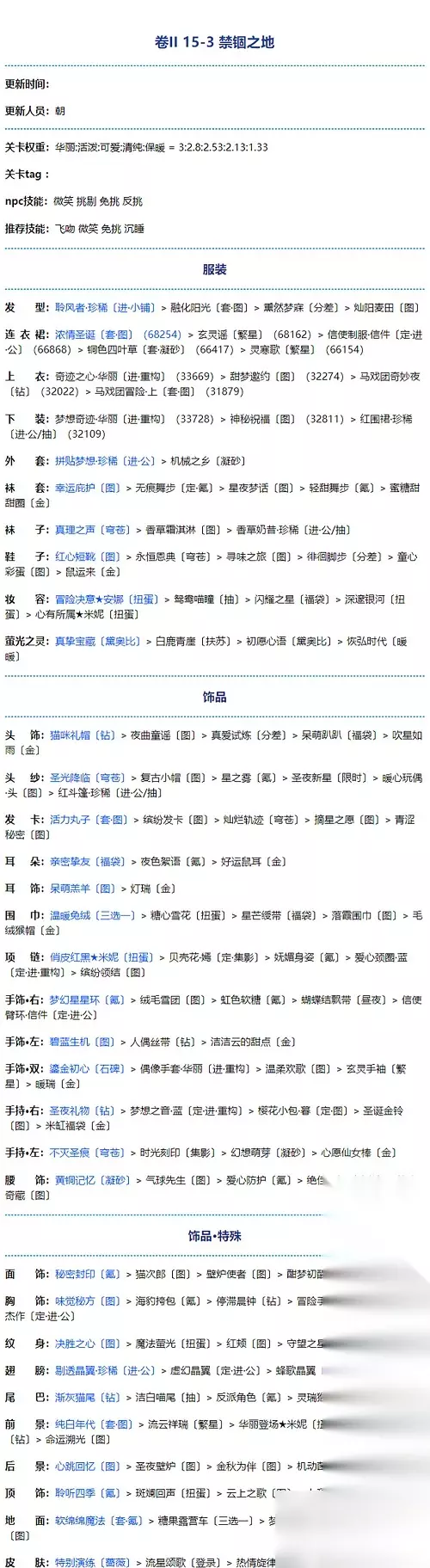 发型:聆风者珍稀[进小铺〕>融化阳光〔套图〕>熏然梦寐〔分差〕>灿阳麦田〔图〕 连衣裙:浓情圣诞〔套图〕(68254)>玄灵谣〔繁星〕(68162)>信使制服信件〔定进公〕(66868)>铜色四叶草〔套凝砂〕(66417)>灵寒歌〔繁星〕(66154) 上衣:奇迹之心华丽〔进重构〕(33669)>甜梦邀约〔图〕(32274)>马戏团奇妙夜〔钻〕(32022)>马戏团冒险上[套·图〕(31879) 下装:梦想奇迹华丽〔进重构〕(33728)>神秘祝福[图〕(32811)>红围裙珍稀〔进公/抽〕(32109) 外套:拼贴梦想珍稀〔进·公〕>机械之乡〔凝砂〕 袜套:幸运庇护〔图〕>无痕舞步〔定·氪〕>星夜梦话〔图〕>轻甜舞步〔氪〕>蜜糖甜甜圈〔金〕 袜子:真理之声〔穹苍〕>香草霜淇淋〔图〕>香草奶昔·珍稀〔进·公/抽〕 鞋子:红心短靴〔图〕>永恒恩典〔弯苍〕>寻味之旅〔图〕>徘徊脚步〔分差〕>童心彩蛋〔图〕>鼠运来〔金〕 妆容:霫险决意★安娜〔扭蛋〕>驽鸯喵瞳〔抽〕≯闪耀之星〔福袋〕>深辽银河〔扭蛋〕>心有所属★米妮〔扭蛋〕 董光之灵:真挚宝藏〔黛奥比〕>白鹿青产〔扶苏〕>初愿心语〔黛奥比〕>恢弘时代〔暖暖〕