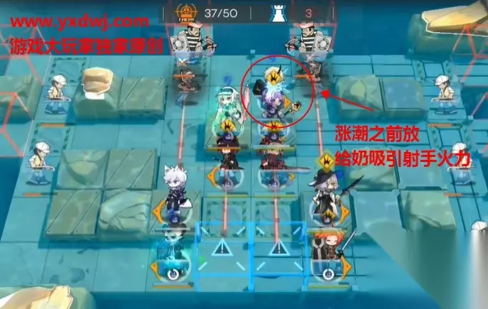 第三步:放好T还有奶 第四步: 在这里我们还有最后一个T的名额,可以在这里把自己练度最低的T留在这里。 再最后一波涨潮之前,把这个T放到两个奶后面,吸收弓箭手的伤害,防止奶被射死。 切记一定要在涨潮之前放!!!涨潮了就放不了了