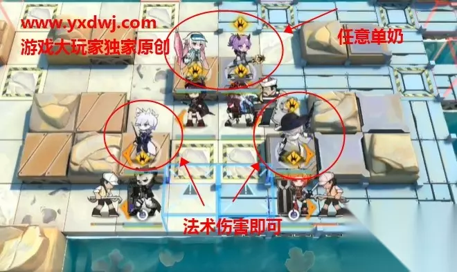 第二步:放两个盾,右边的放强一点的 第三步: 现在左右下面两个地方放两个法术伤害,法师,辅助角色,都可以,但是要是法术伤害。 群体法师也可以,但是要注意卡费的问题,推荐带单体的。 然后再上面两格放两个单奶,群奶奶不到T,单奶可以够到。