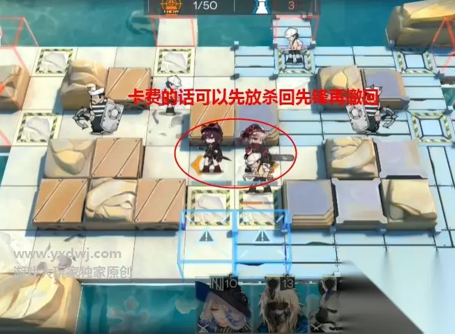 明日方舟DH-5低配三星挂机阵容 第一步: 首先根据下面的位置摆放两个近卫,随便什么都可以,也可以先放先锋完了再撤回换输出高的近卫。 卡费就先放杀回先锋,完了再撤回。