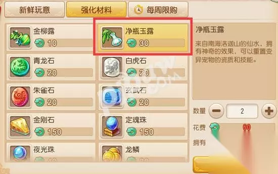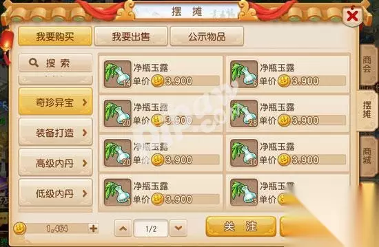 梦幻西游手游净瓶玉露怎么获得? 之前只能通过商城直接购买,30仙玉一个净瓶玉露,在每周限购那里也有机会买到,以前是不能摆摊购买的,2月22日更新以后玩家可以在摆摊——奇珍异宝使用金币购买净瓶玉露。