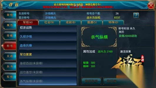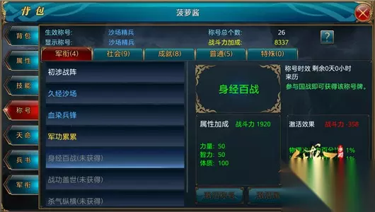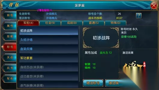 称号激活,提升战力 称号的激活分为激活称号、激活属性、激活称号和属性。激活称号只是激活称号而不激活属性;激活属性则是激活“激活效果”下面的属性,而称号不被激活,低调的玩家可以选择激活白色称号,激活高属性的称号属性;激活属性及称号则是直接将称号和属性同时激活,让其他玩家看到自身称号。 激活称号并不会提升玩家自身战斗力,在选择激活什么称号属性的时候需要注意自身战斗力及攻击、防御等属性。“初涉战阵”、“久经沙场”、“血染兵锋”、“军功累累”、“战功盖世”、“杀气纵横”是增加敏捷和精神,都是可以增加玩家物理防御和法术防御的属性,适合所有玩家使用;而“身经百战”是增加力量、智力和体质的,同样适合所有玩家使用。