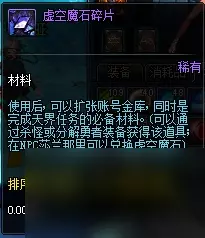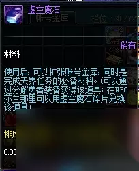 50级魔法封印板甲上衣在拍卖行的价格在80万金币上下,原因在于可以通过圣物转换书将之转换成圣物上衣。50级圣物板甲上衣对于奶妈和奶爸来说有大用,所以价格一直很高,很多人选择自制,而自制的必需品就是这件上衣。 三、虚空魔石碎片