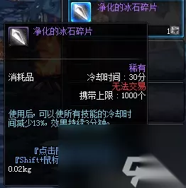 1个冰石碎片可以兑换1个净化的冰石碎片,使用效果是所有技能冷却时间减少13%,相比精神刺激灵药它的性价比会高很多,也是大多数平民玩家的选择。所以冰石碎片在拍卖行的价格常年趋于9000左右,千万不要错过了哦! 二、50级魔法封印板甲上衣