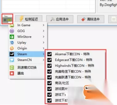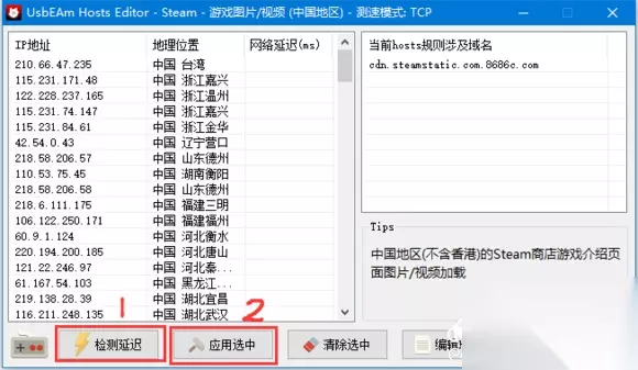点击下图的“检测延迟”按钮,在右侧选择一个较低延迟的ip地址,点击“应用选中”即可。