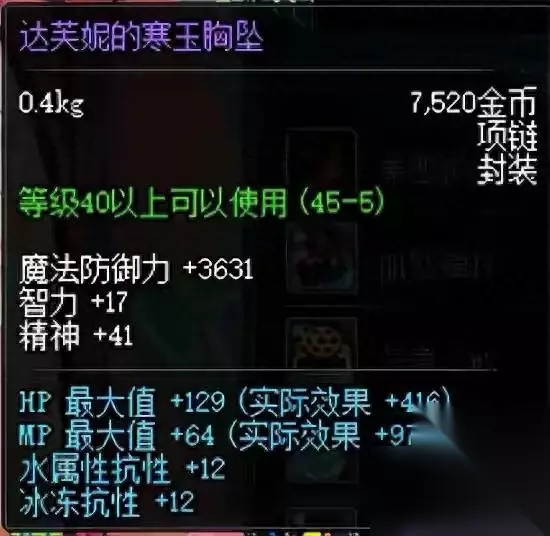 4、达芙妮的寒玉胸坠 达芙妮主要是PK用的,加蓝血量上限,还加冰抗和冰冻抗性,是一件不错的PK装备,而且40多级那时候还在刷雪山,加点抗性也不错,价格要稍微低一些。