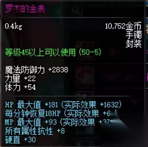 6、拉罗的迷失之戒 非常不错的一件装备,加回蓝,而且加15%智力,这个数值是很高的,因为它增加的不是站街的智力,而是在地下城中的当前智力,例如阿修罗开了刻印,鬼泣开了智力红阵,都能享受到拉罗的加成,魔法职业后期刷图必备的一件装备,不过触发条件是物理攻击比较蛋疼。当时都在400W以上。