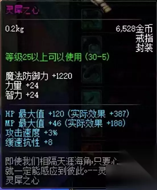 7、灵犀之心 土豪必备,3%攻击速度戒指,当时戒指好像只有灵犀加攻速,有这么好的一个装备,热爱PVP的玩家们有福了,入手以后绝对是质的提升,不过那价格平民是不要想了。