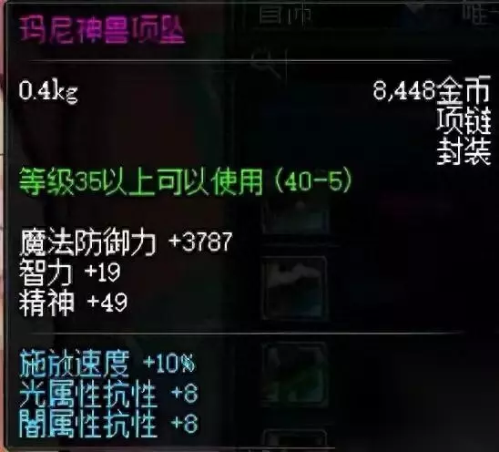 8、玛尼神兽项坠 10%释放速度项链,和贤者戒指搭配堆释放速度,当时是元素鬼泣召唤等职业的PK神器,这个项链当时贵的一匹,500W以上了。