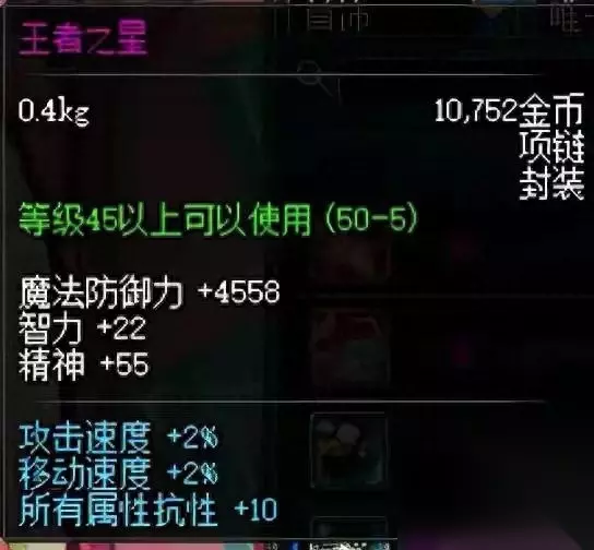 10、王者之星 王者之星我记得是当时最贵的首饰了,千万级别,+2%攻击移动速度,50粉项链,魔法防御力等属性也是拉满,使之成为高端PvP的有力助手,而且适合超过一半的职业种类使用。就像名字一样王者之星,只要王者才配戴此项链,哈哈开玩笑,不过价格太贵神豪才能戴的起。那时候鳞岩+风衣+斩影裤子腰带+王星+墨竹+灵犀(鞋子忘记是啥了)神豪标准装,满满得回忆啊!